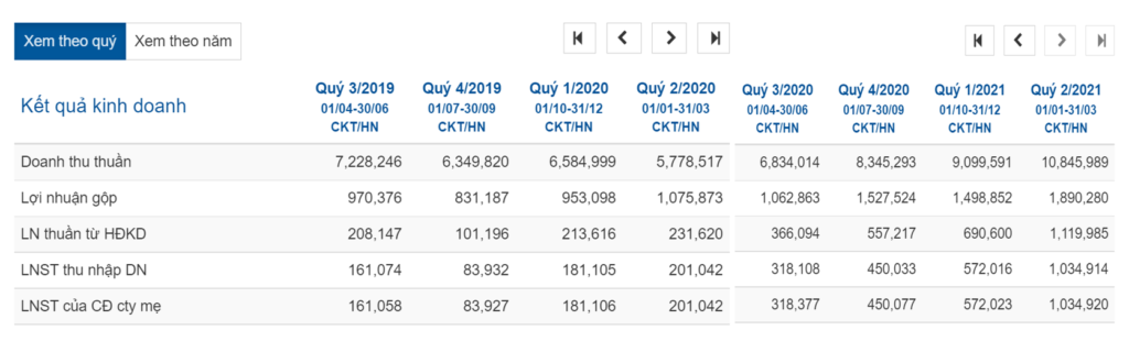 Kết quả kinh doanh của HSG giai đoạn quý 3/2019 đến quý 2/2020 ổn định ở mức thấp dưới 181 tỷ/quý, sau đó khi tăng vọt lên 201 tỷ khi công bố báo cáo quý 2/2020 (xem hình dưới). Tôi đã bị thu hút bởi báo cáo kinh doanh này, và bắt đầu hành trình kiếm được siêu lợi nhuận trên HSG kể từ đầu tháng 4/2020 cho tới khi cổ phiếu đạt đỉnh cao nhất vào giữa năm 2021.
